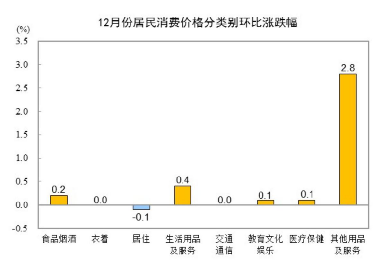 12月份,全国居民消费价格环比上涨0.2%。其中,城市上涨0.2%,农村上涨0.2%;食品价格上涨0.3%,非食品价格上涨0.1%;消费品价格上涨0.3%,服务价格持平。