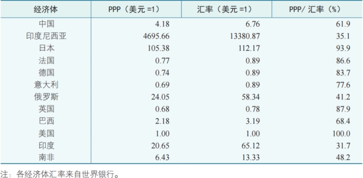 利用经济指标进行跨国比较是衡量经济体经济增长绩效和评价发展阶段的重要方法,这需要将各经济体货币转化为同一货币。通常,人们使用官方汇率将各经济体货币转化为同一货币。但一些经济学家认为,汇率易受国际资本流动、宏观经济波动的影响,只体现了不同经济体可贸易品间的比价关系,未能消除经济体间价格水平差异,利用汇率进行国际比较在一定程度上扭曲了比较结果。为克服汇率作为货币转换因子的弊端,经济学家发明了“购买力平价(Purchasing Power Parity,简称PPP)”这一指标。