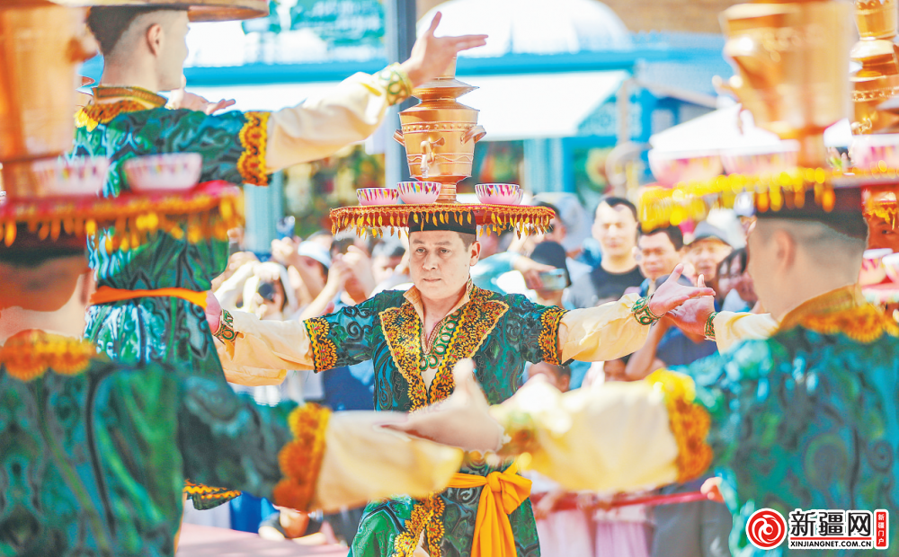 8月22日,大巴扎步行街,来自阿克苏地区库车市文化馆(龟兹歌舞团)的表演团队表演舞蹈《萨玛瓦尔》。(全媒体记者米热扎提·木塔力甫摄)