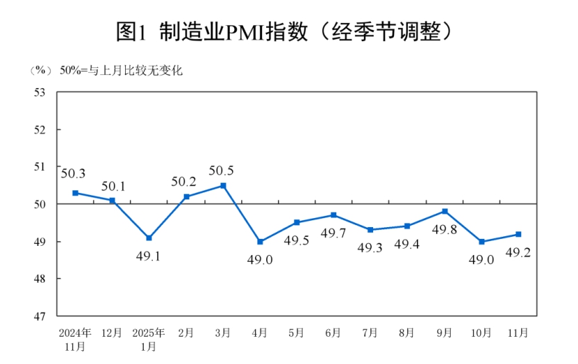 11月份,制造业采购经理指数(PMI)为49.2%,比上月上升0.2个百分点,景气水平有所改善。