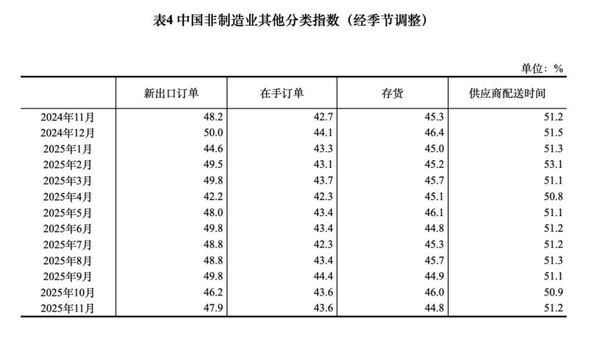 供应商配送时间指数为50.1%,比上月上升0.1个百分点,表明制造业原材料供应商交货时间略有加快。